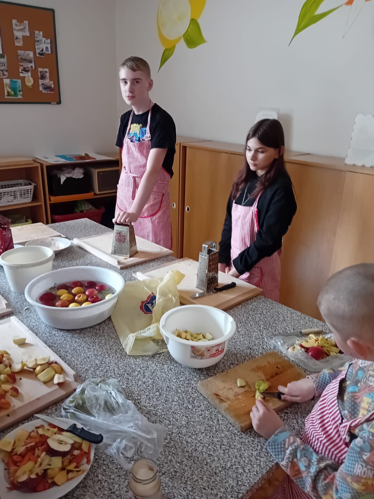 Tentokrát jsme si s dětmi vyzkoušeli vaření v naší školní kuchyňce. Společně jsme krájeli jablíčka, přidávali skořici a vařili voňavý jablečný kompot. Děti si práci moc užily a s chutí si pochutnaly na vlastnoručně připravené dobrotě.